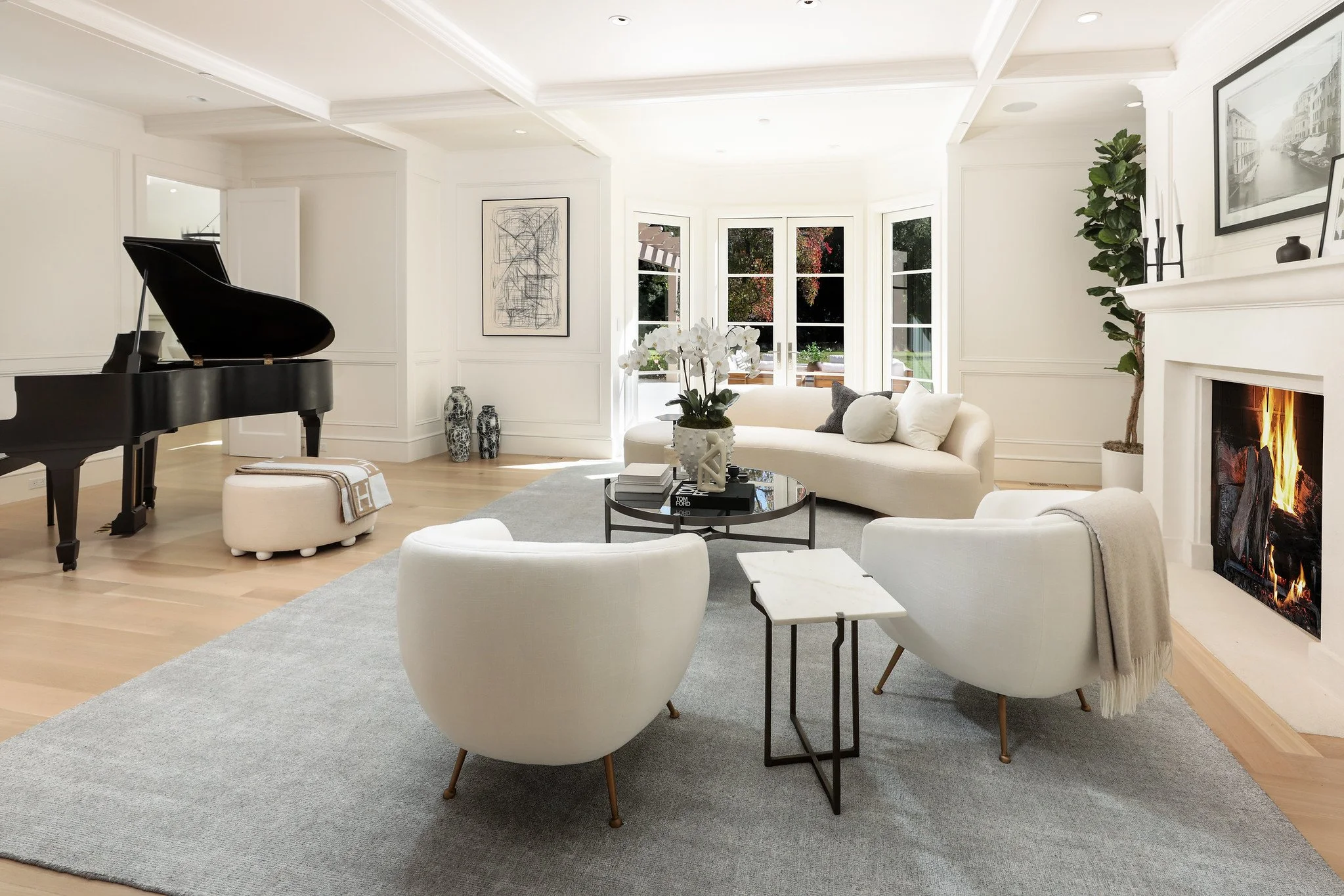 • Living room with coffered ceiling and wall moldings, fireplace, and French doors to the rear grounds