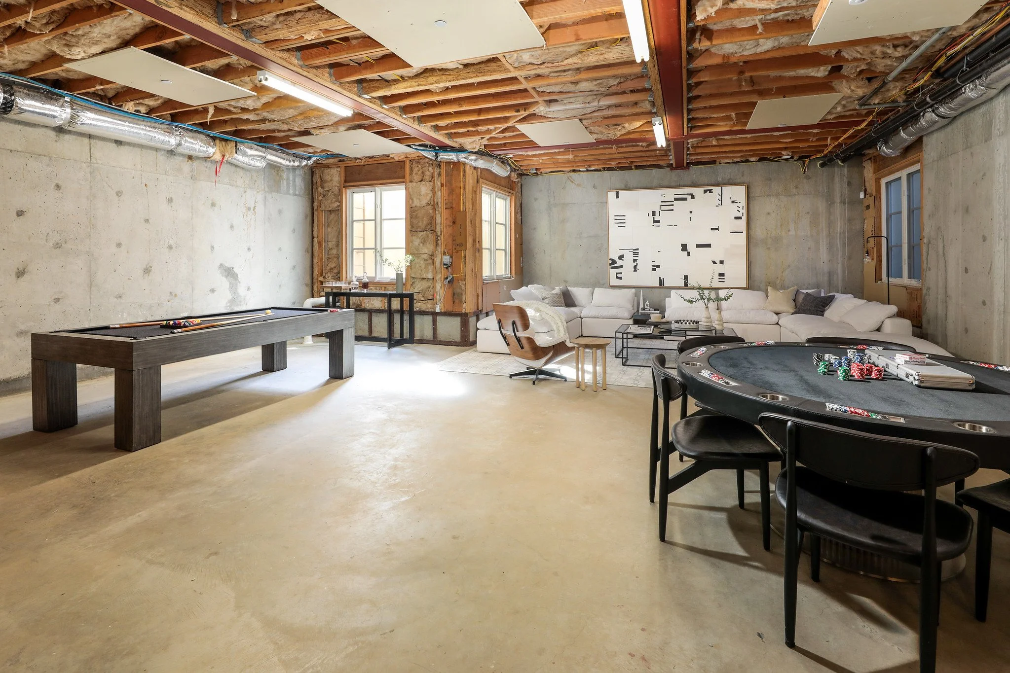 • Unfinished lower level with lofty ceilings, windows, two access points with potential for recreation, theatre, or fitness